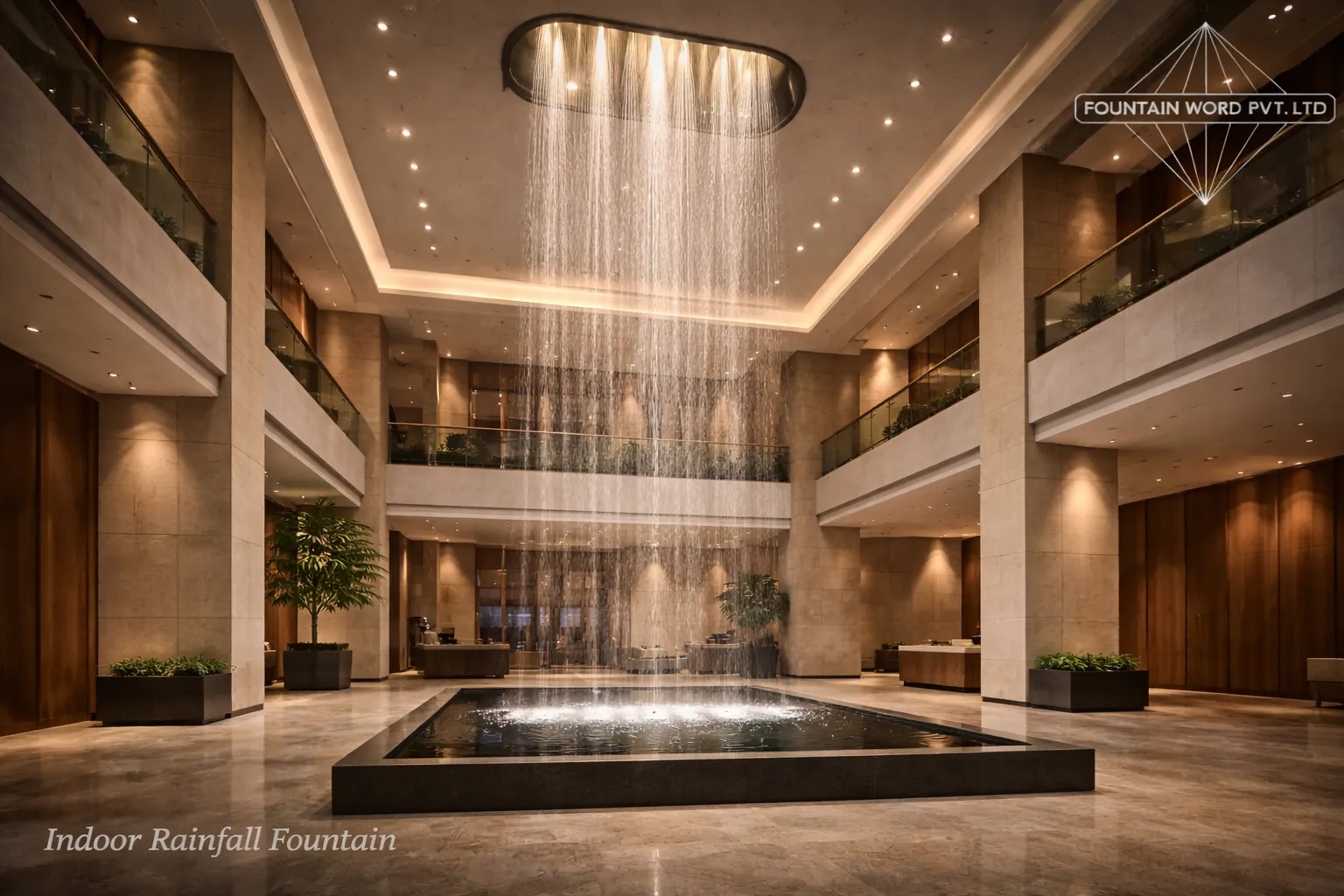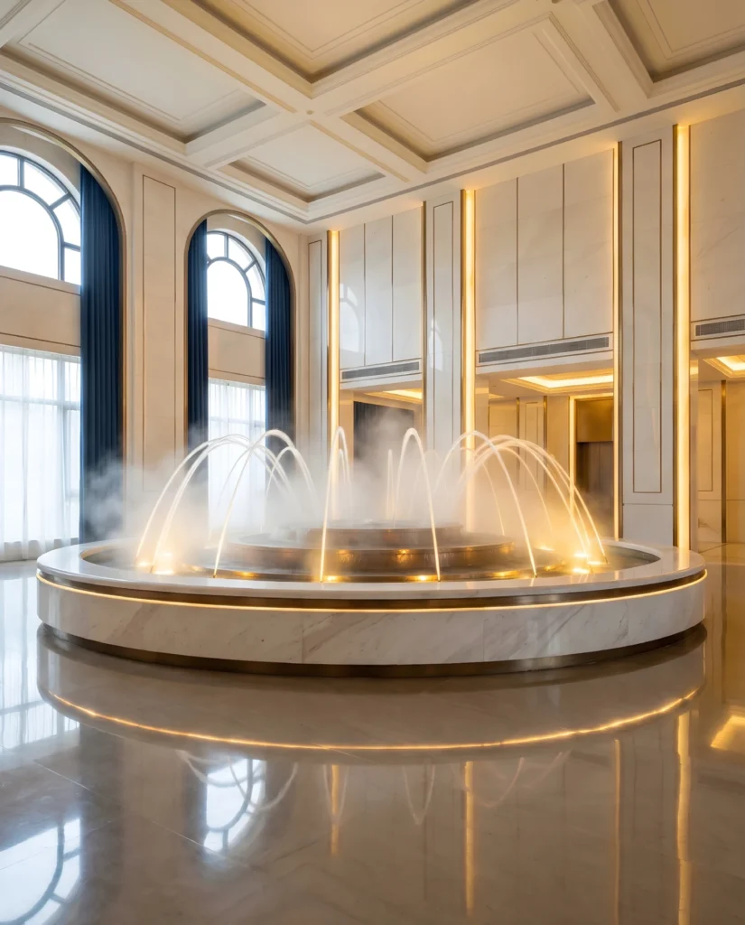 Signature lobby fountains, resort waterfalls, and guest experience water installations that elevate luxury hospitality environments.